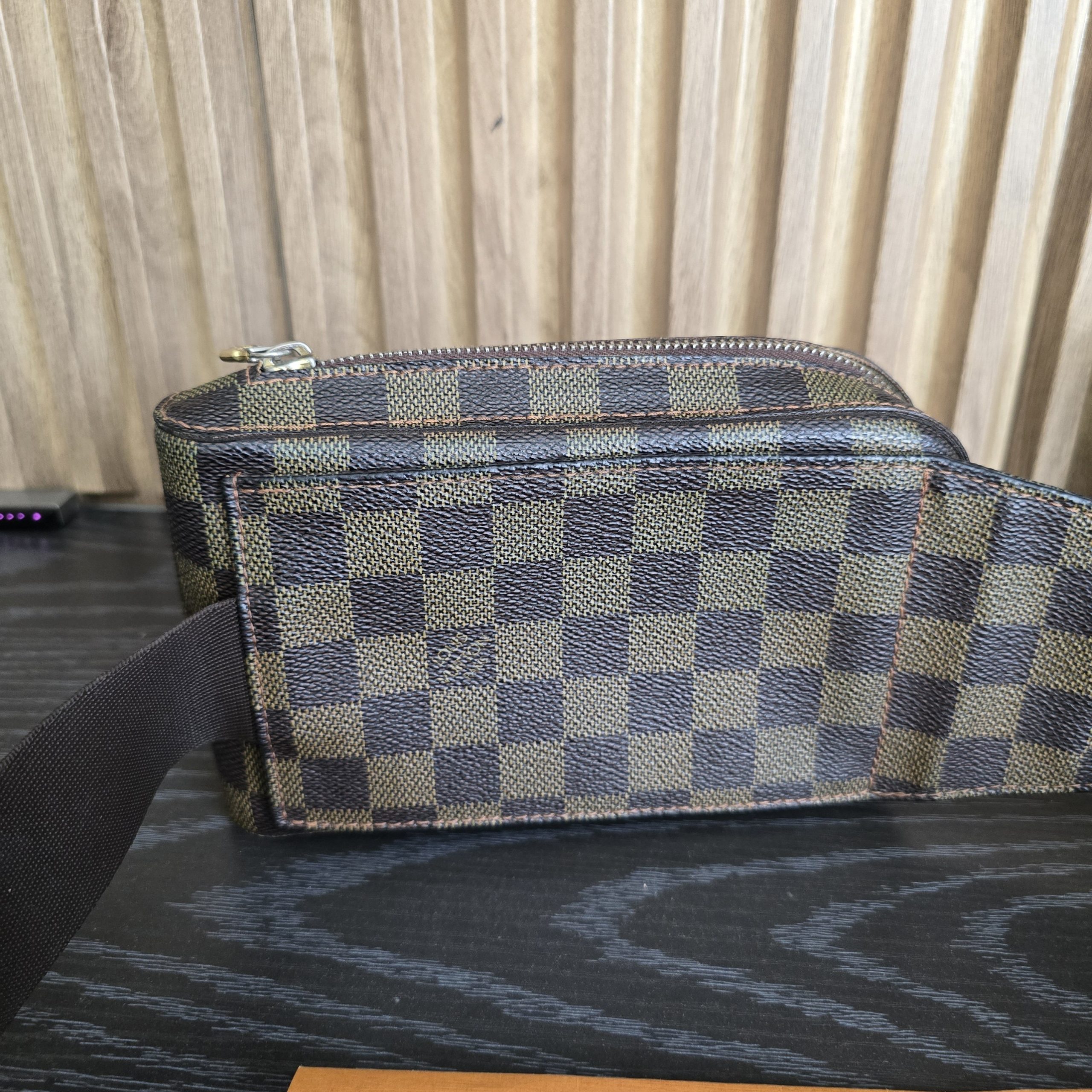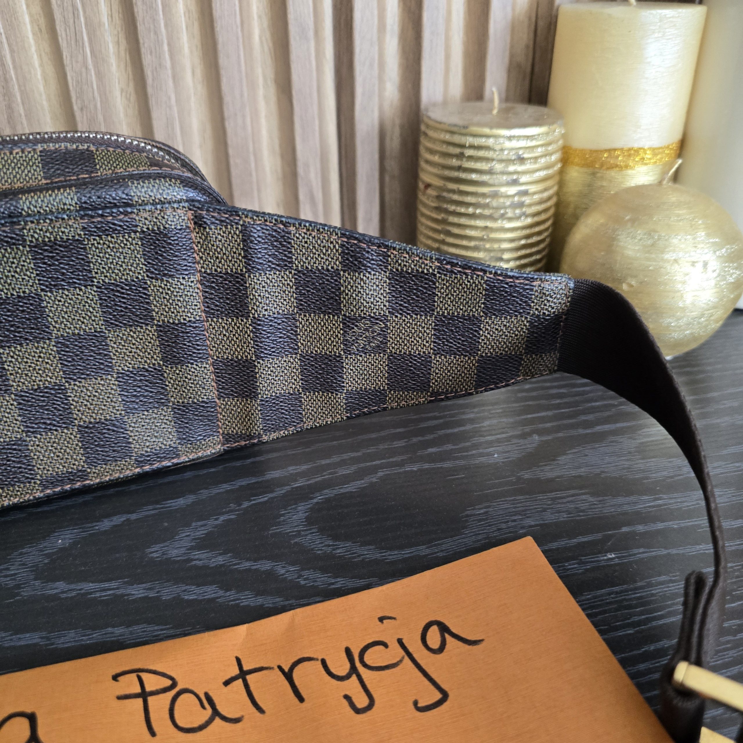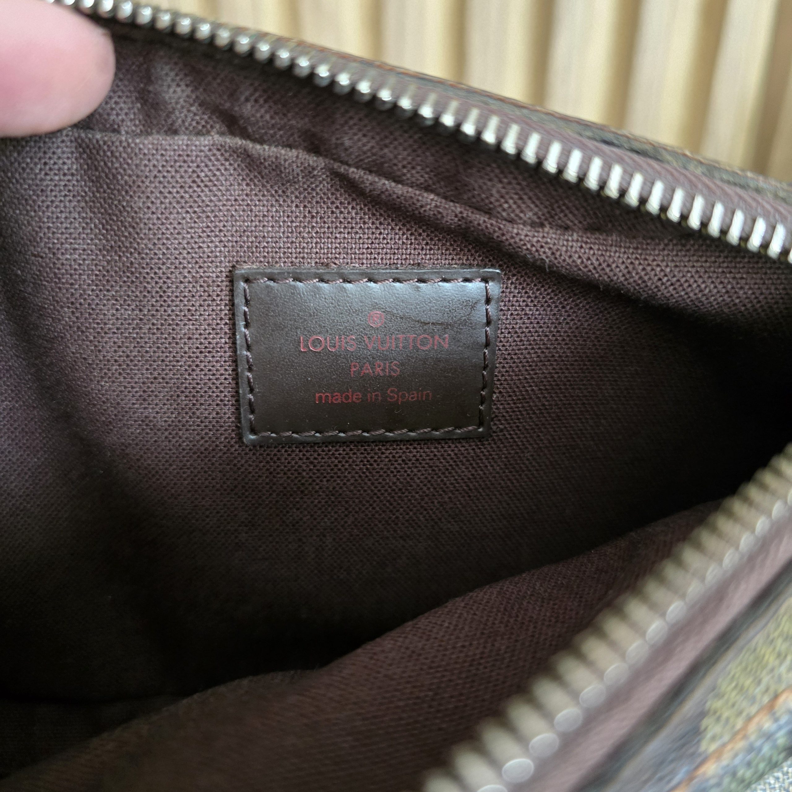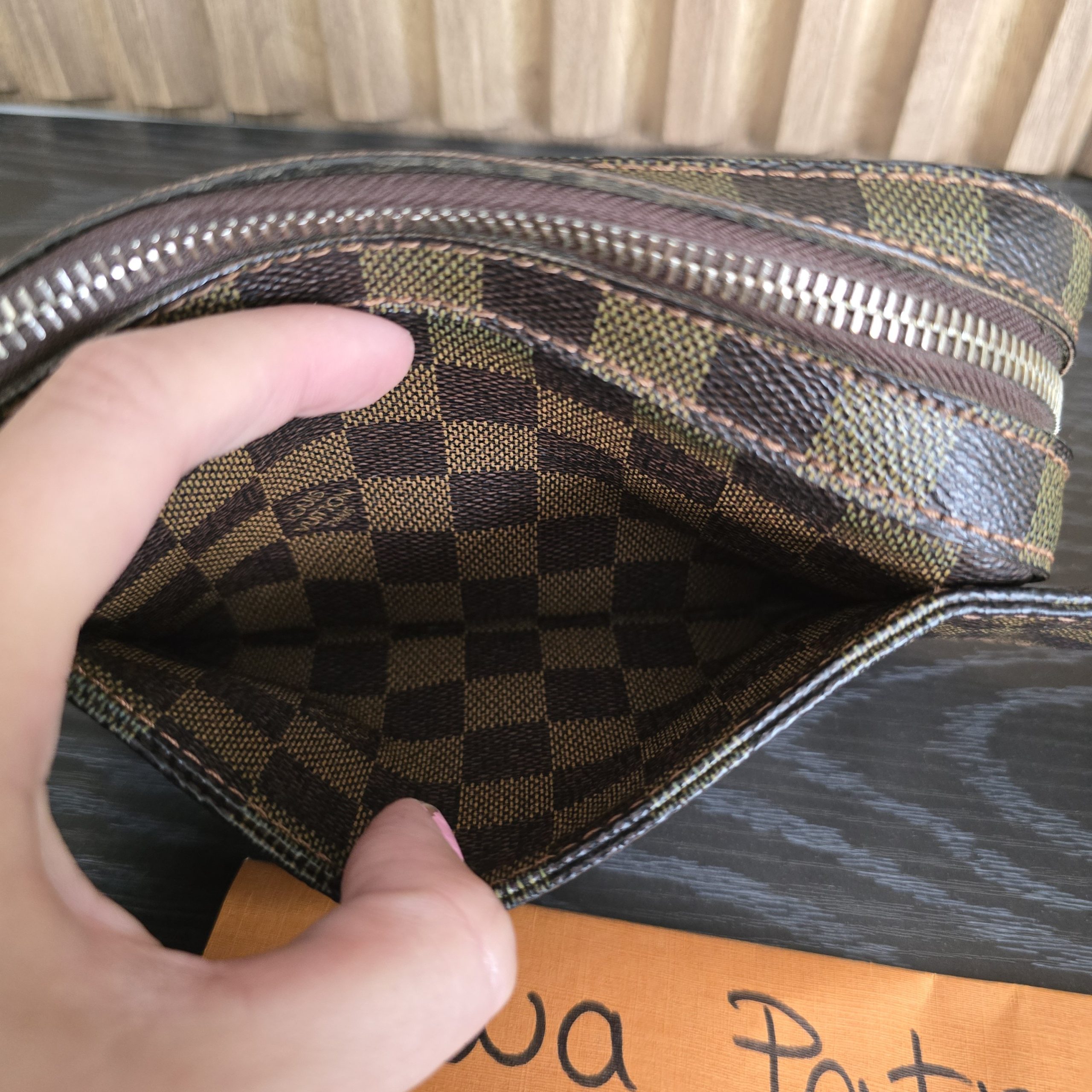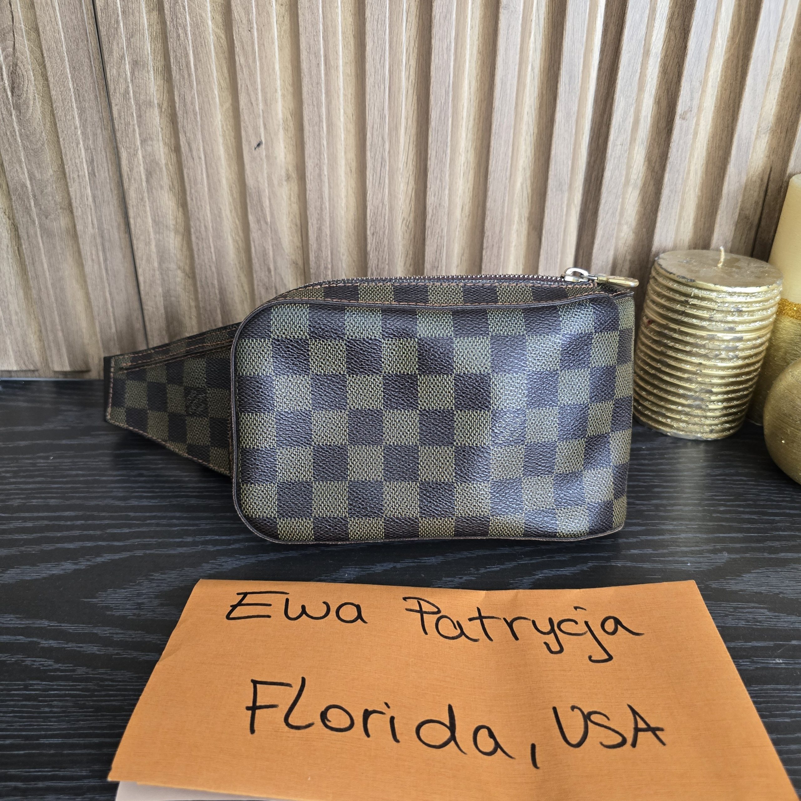 Gently used condition, slight discoloration on canvas, minimal wear on corners, no cracks on canvas, light tarnish on hardware. clean inside